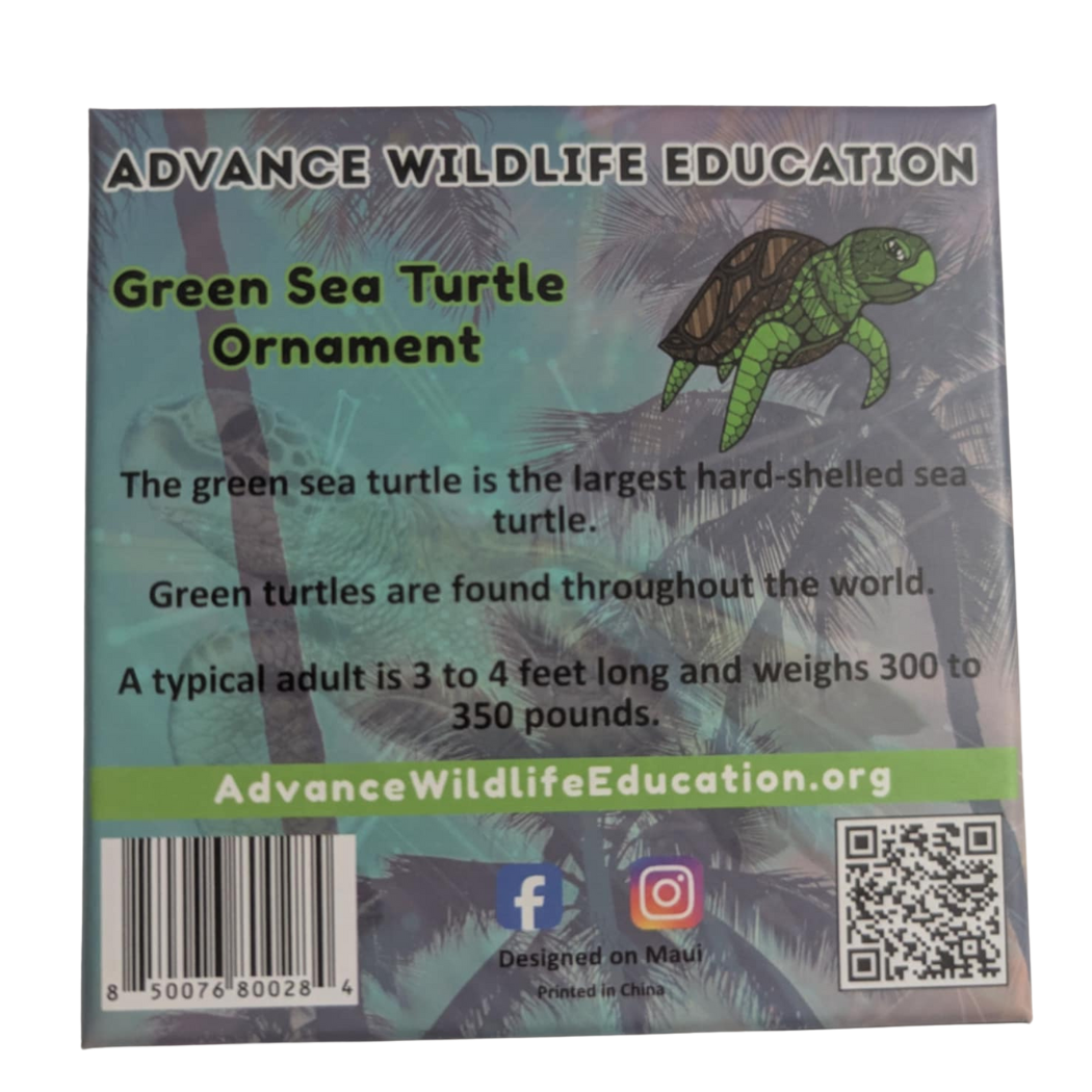Each ornament measures 3 x 3 inches and is finished with a custom Advance Wildlife Education green ribbon, adding a refined touch that stands out on any Christmas tree. The intricate enamel detailing reflects light beautifully, making it a stunning keepsake for ocean lovers, Hawai‘i enthusiasts, and collectors of meaningful holiday décor.