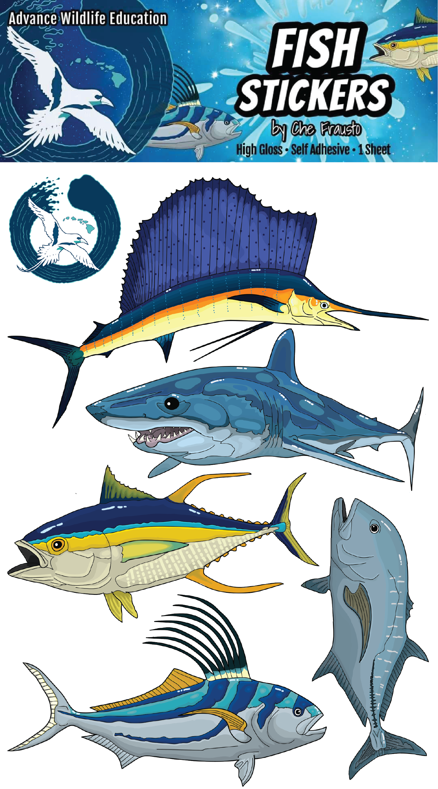 - Sheet of high-quality stickers featuring Hawaiian fish species