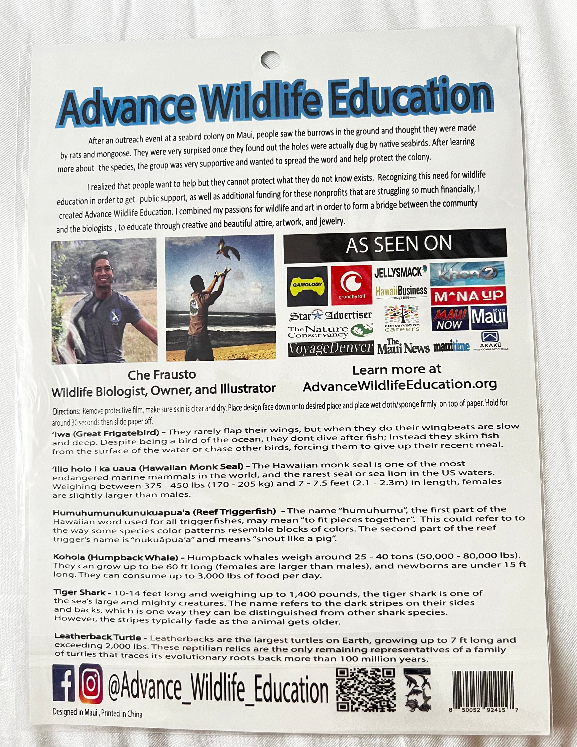 The back of the tattoo sheet provides educational information about each featured marine species, their ecological importance, and conservation status. Waterproof and long-lasting, these tattoos are perfect for beach days, snorkeling trips, or anytime you want to showcase your love for the ocean. Your purchase directly supports Advanced Wildlife Education's marine conservation initiatives and educational programs focused on protecting Hawaii's precious marine ecosystems.