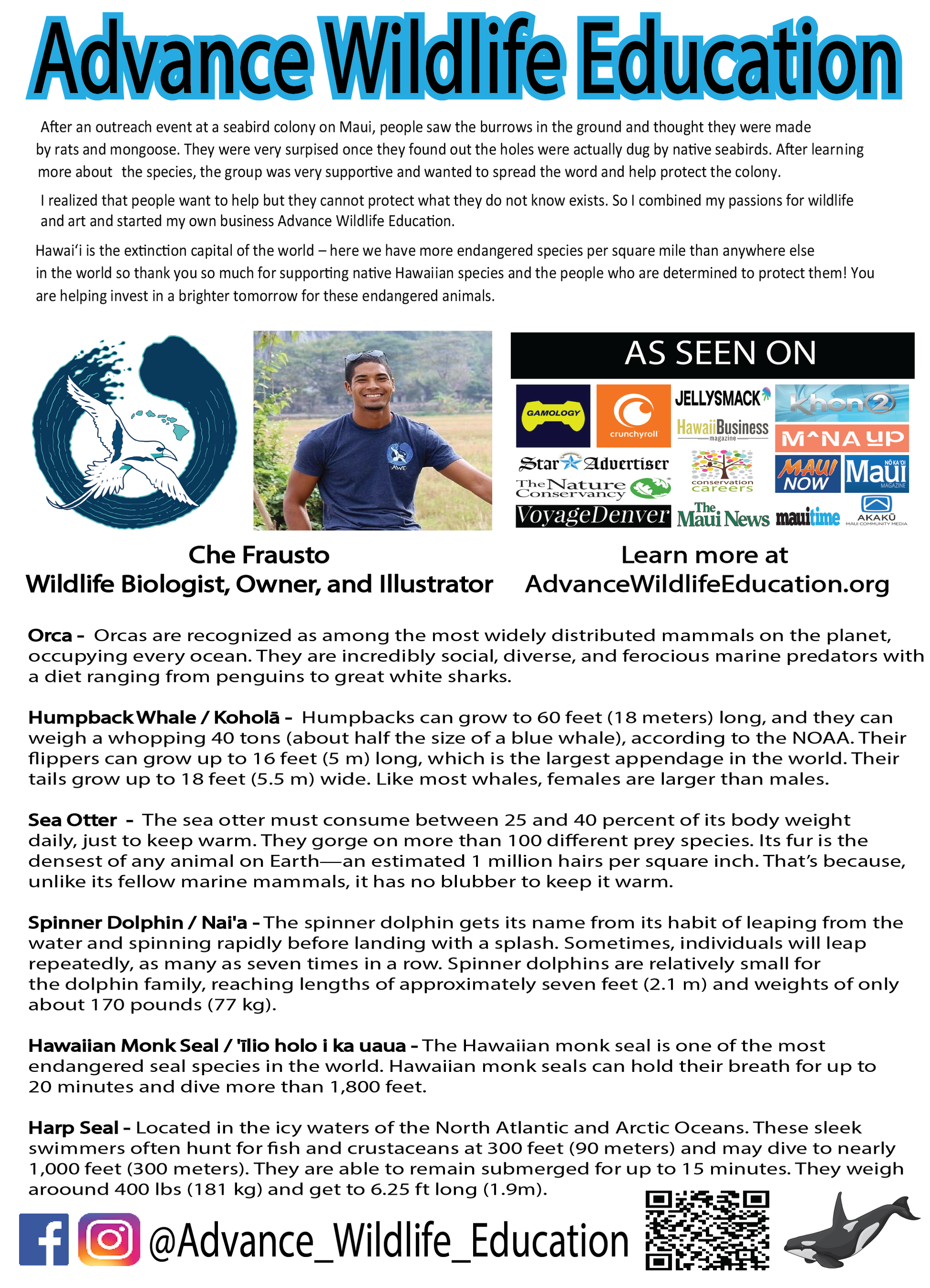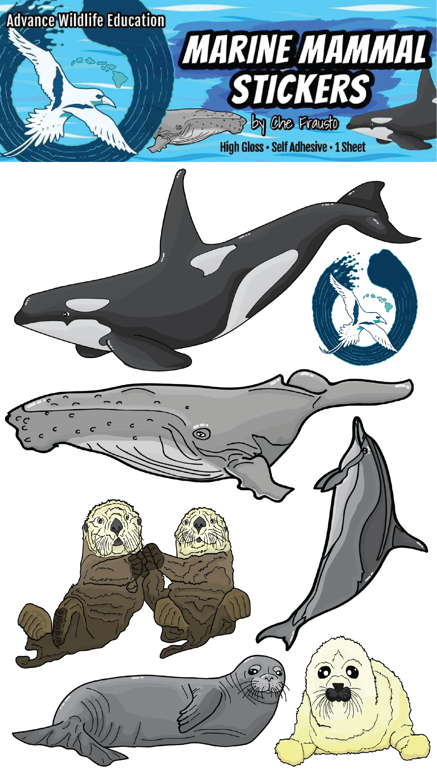 - Sticker sheet featuring 6 marine mammal species: Orca, Humpback Whale, Sea Otters, Spinner Dolphin, Harp Seal, and Hawaiian Monk Seal