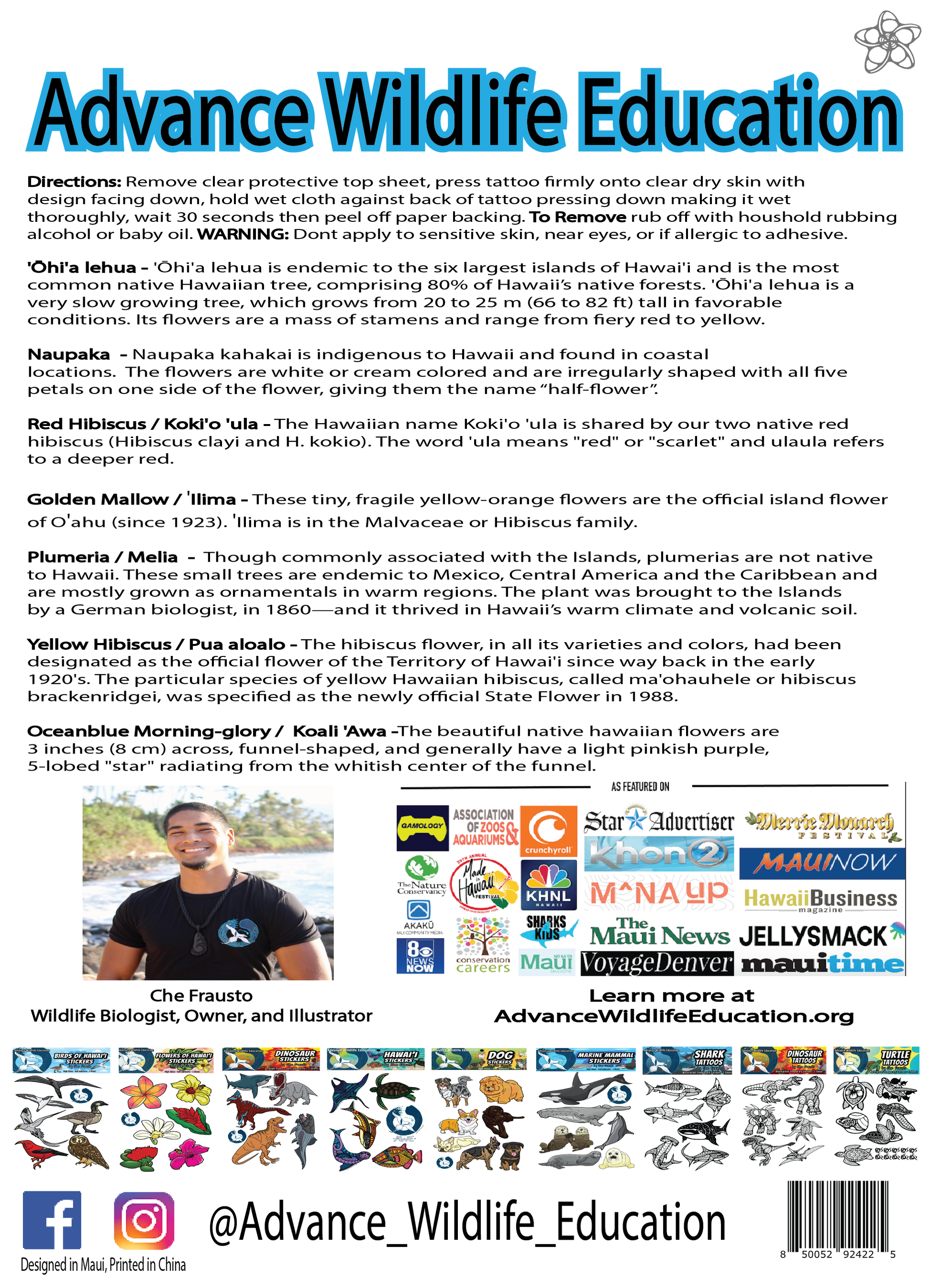 Discover the beauty of Hawaiian flora with our silver waterproof temporary tattoo sheet. Each flower design is accompanied by a short educational description on the backside, allowing you to learn about the cultural significance, characteristics, and stories behind these beautiful blooms as you wear them.