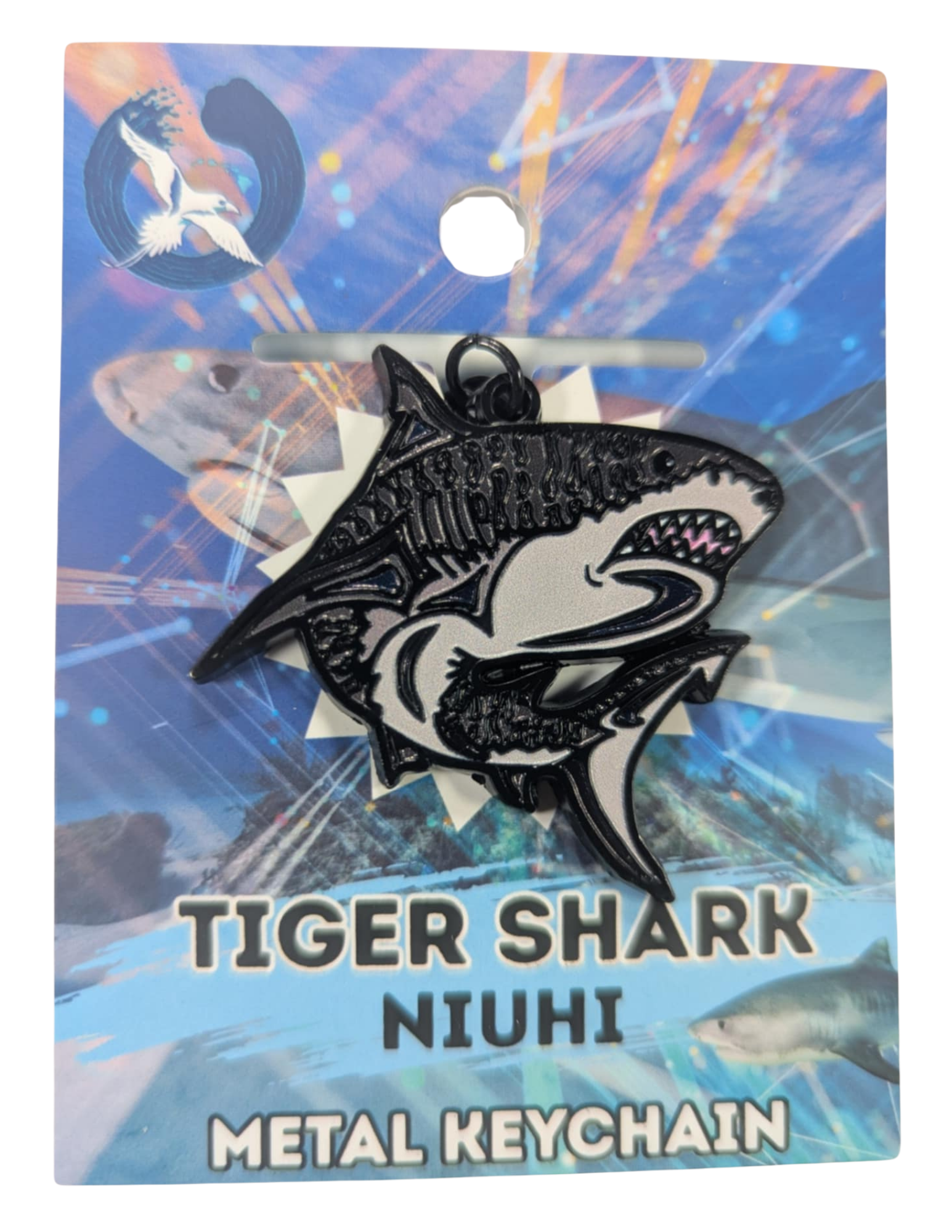 Crafted from sturdy metal and accented with smooth enamel detailing, this keychain showcases the bold form and unmistakable stripes of the tiger shark—one of Hawai‘i’s most revered marine predators. Known for its strength, adaptability, and importance in Hawaiian culture, the tiger shark represents deep respect for the ocean and its balance.