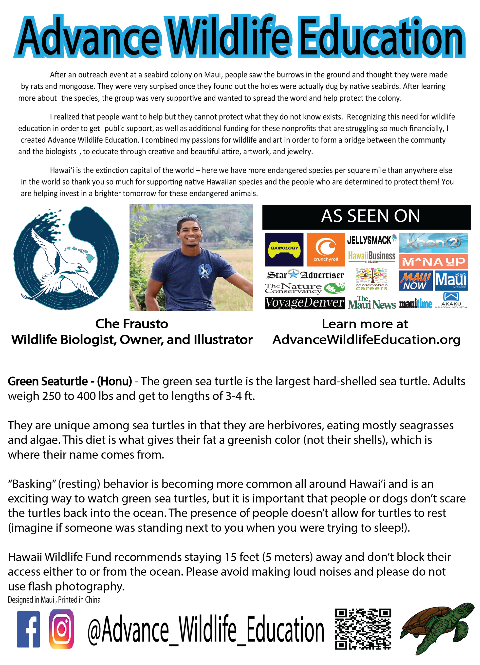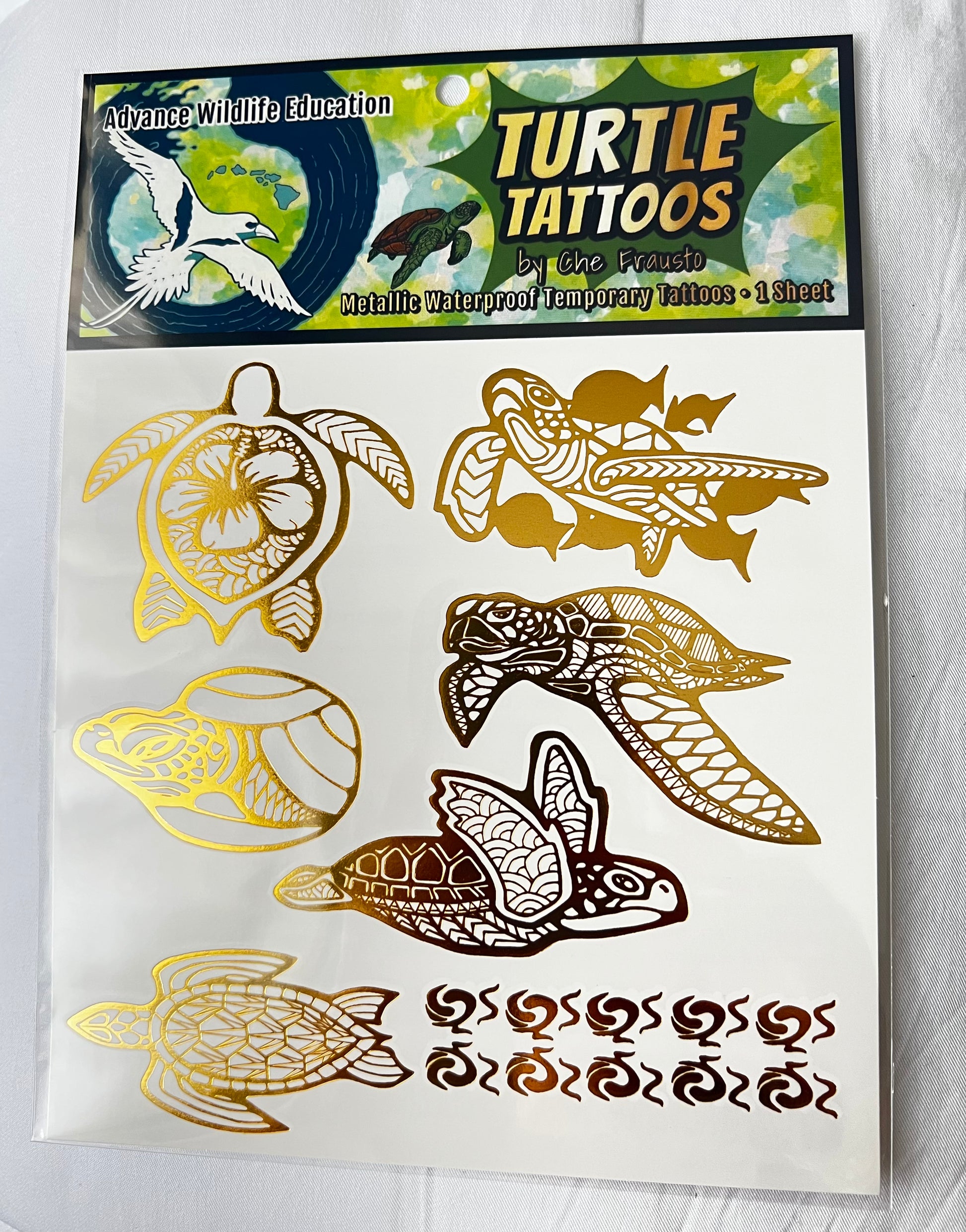 The back of the tattoo sheet provides educational information about sea turtles, their conservation status, and cultural significance. Waterproof and long-lasting, these metallic tattoos create the appearance of elegant jewelry while allowing you to celebrate these magnificent creatures. Perfect for beach days, luaus, or anytime you want to add a golden touch of island style to your look. Your purchase supports Advanced Wildlife Education's efforts to protect sea turtles and their habitats.
