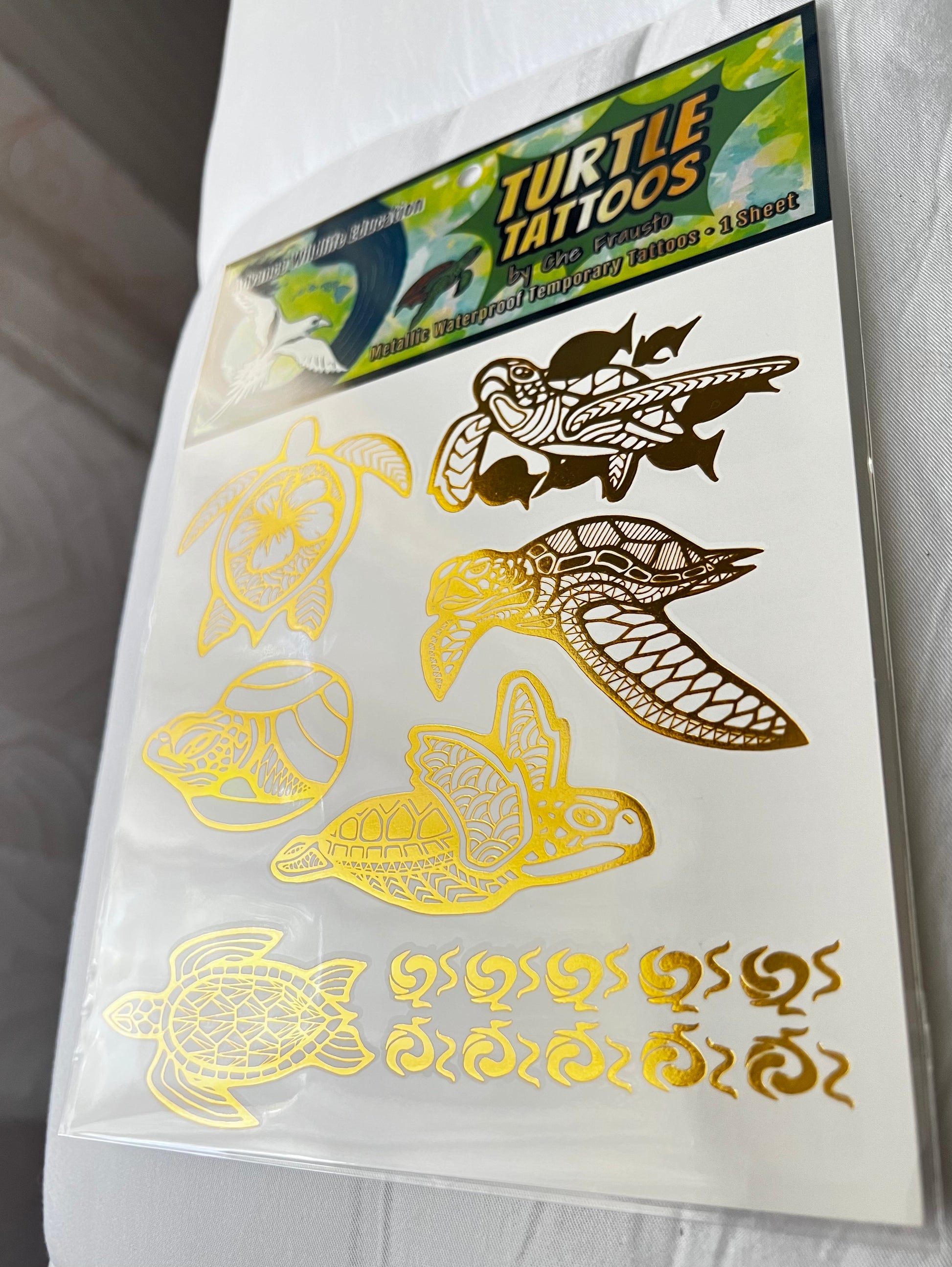 - Sheet of gold metallic waterproof temporary tattoos featuring sea turtles